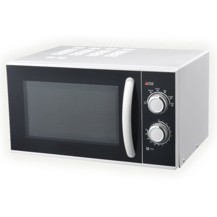Forno a microonde con comandi meccanici e piatto girevole. Lamiera verniciata bianca con porta vetro - 6 livelli di cottura - funzione defrost - potenza resa 0.9kW.